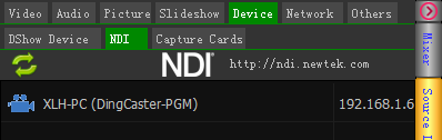 NDI library window lists all NDI devices found in the Network.