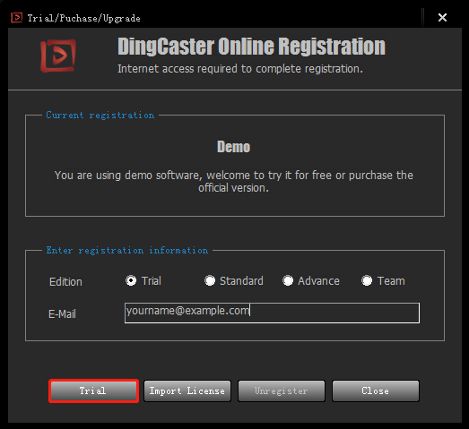 - It can be registered as "trial edition" free of charge, and can be fully functional for 30 days. When the demo software starts running, the "Online Registration" dialog box pops up.