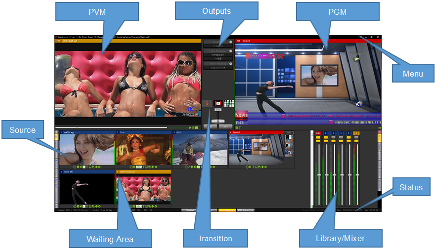 Including Mixer, Sources Library, Title, Scene, Effect, Recording and so on..